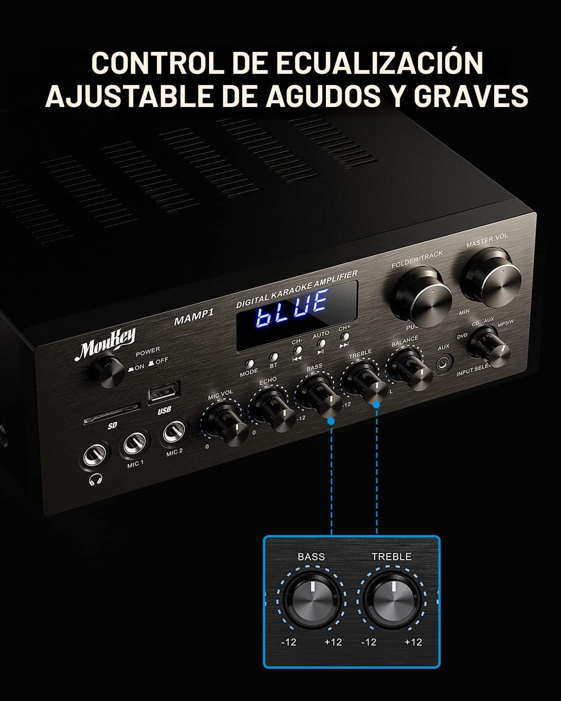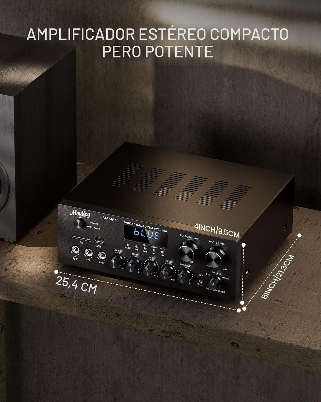 El Moukey MK0101 es un amplificador estéreo versátil y compacto diseñado para ofrecer sonido claro, potente y envolvente. Ideal para karaoke, cine en casa, estudios, aulas, presentaciones o uso personal, combina conectividad moderna, controles precisos y funciones avanzadas para una experiencia de audio completa.