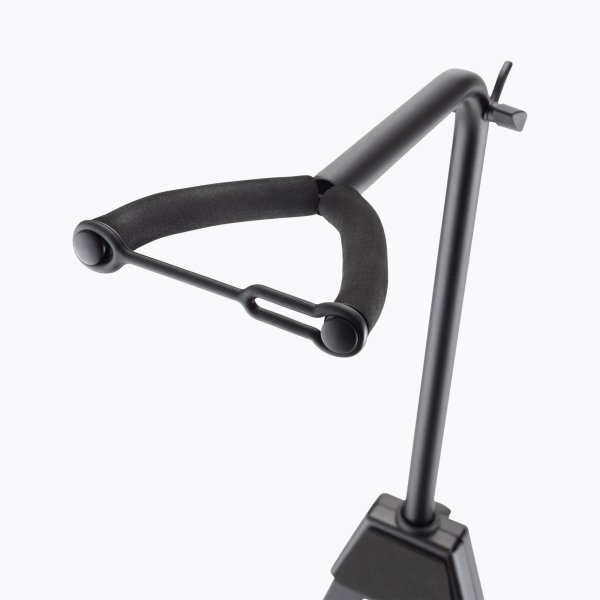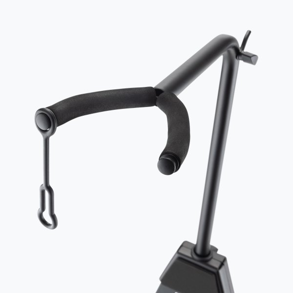 El yugo inferior ajustable en altura permite adaptarlo a distintos tamaños de instrumentos, asegurando un soporte estable y personalizado. Además, incluye un gancho trasero para colgar el arco, manteniendo todo organizado y siempre al alcance.