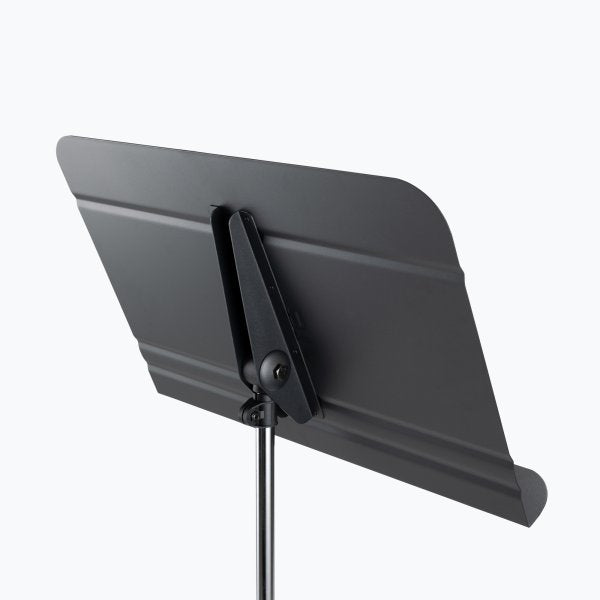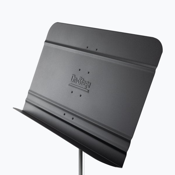 El On-Stage SM7711B es un atril orquestal robusto y elegante, ideal para músicos, directores y salas de concierto que buscan resistencia, durabilidad y un aspecto profesional impecable. Su estructura combina eje y base de acero reforzado con una bandeja de aluminio ligera, perfecta para sostener desde hojas sueltas hasta libros de partituras de gran tamaño.