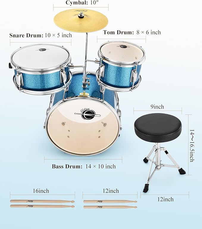 Kit completo para principiantes: Batería de 3 piezas ideal para niños de 3 a 10 años. Incluye bombo, tom, caja, platillo, pedal, taburete ajustable y 2 pares de baquetas (infantiles + estándar 7A).