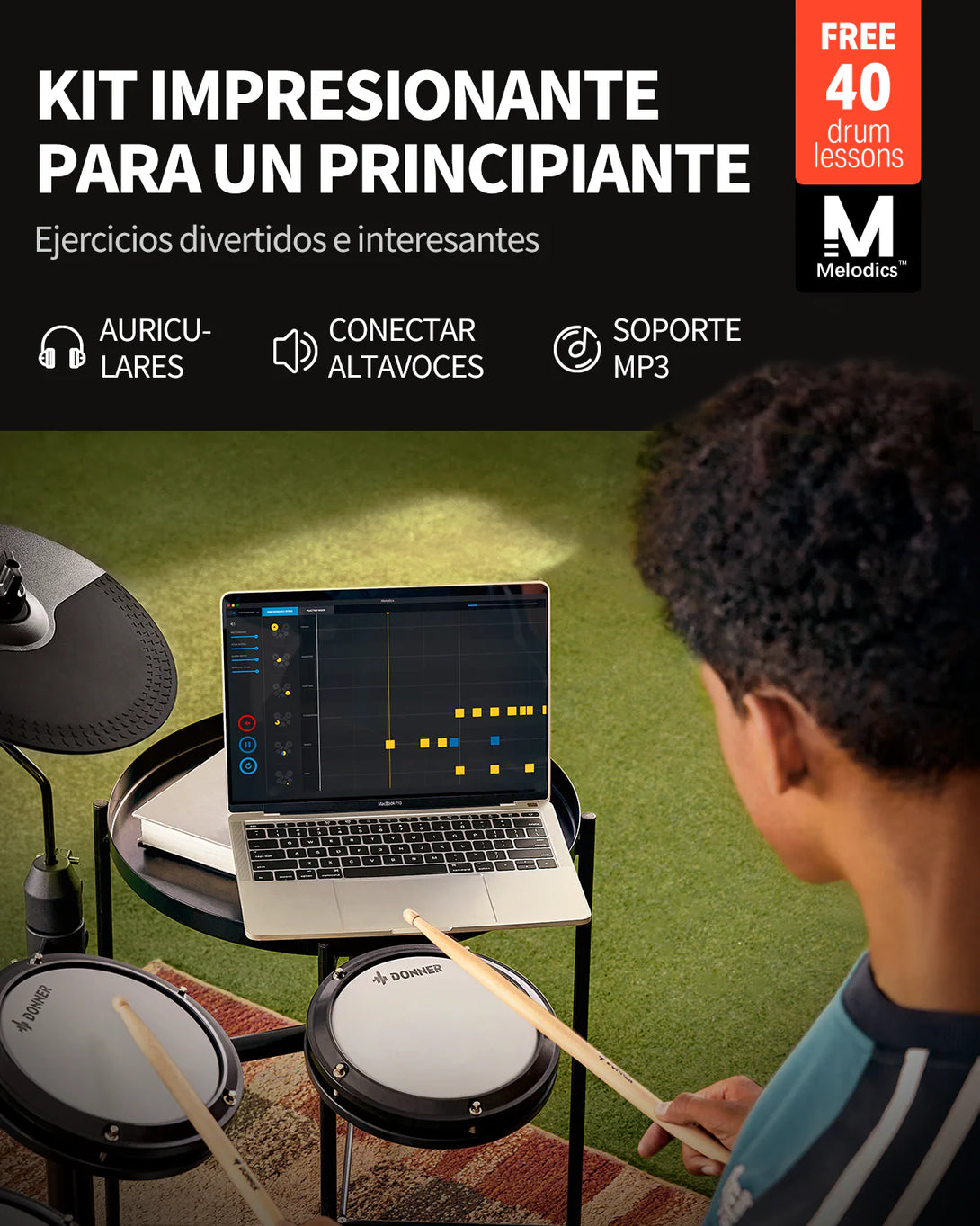 La Donner DED-80MAX es una batería electrónica compacta diseñada para ofrecer una experiencia de ejecución silenciosa, precisa y versátil. Ideal para práctica en casa, estudio, grabación o aprendizaje, combina parches de malla de doble capa, pads sensibles a la velocidad y un módulo completo de funciones para mejorar técnica, expresión y control.