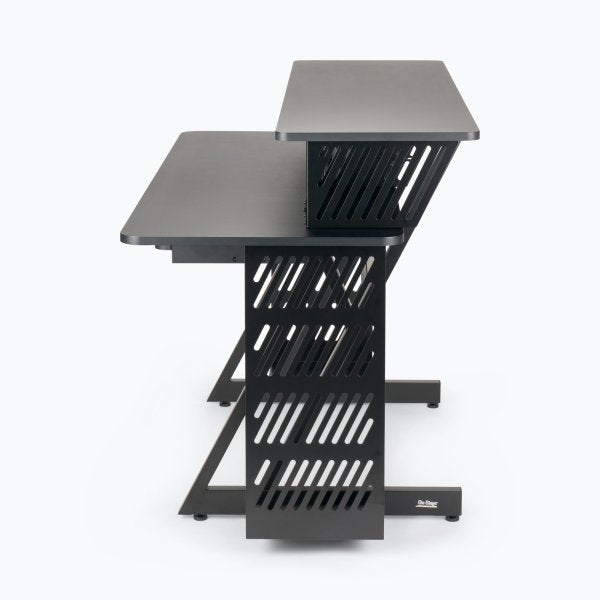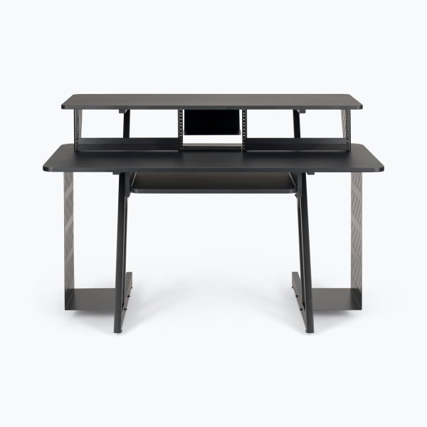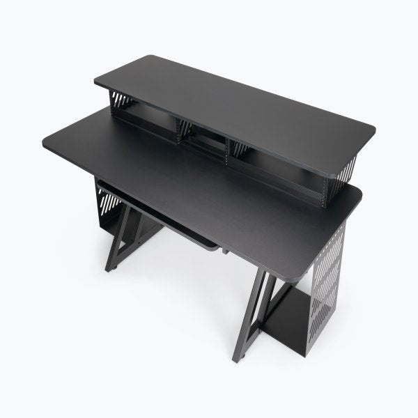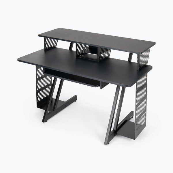 La superficie principal amplia ofrece espacio suficiente para mezcladoras, teclados o controladores, mientras que la plataforma elevada está pensada para monitores de estudio y pantallas, mejorando la ergonomía y la experiencia de mezcla. Además, incluye bandeja deslizante para teclado, soporte para dispositivos móviles y dos racks integrados de 3U cada uno (total 6U), ideales para montar tus equipos de audio profesional.