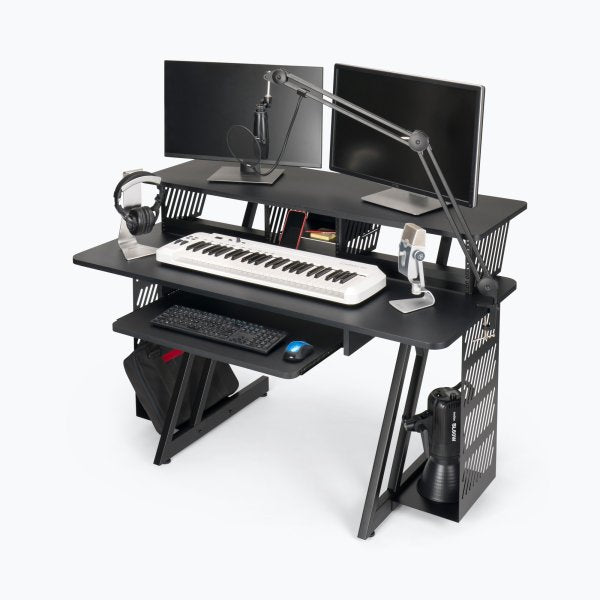 Fabricado con madera resistente y estructura metálica, soporta hasta 175 lb y garantiza estabilidad y durabilidad. Es la estación perfecta para músicos, productores y creadores que buscan un espacio eficiente, moderno y bien organizado.