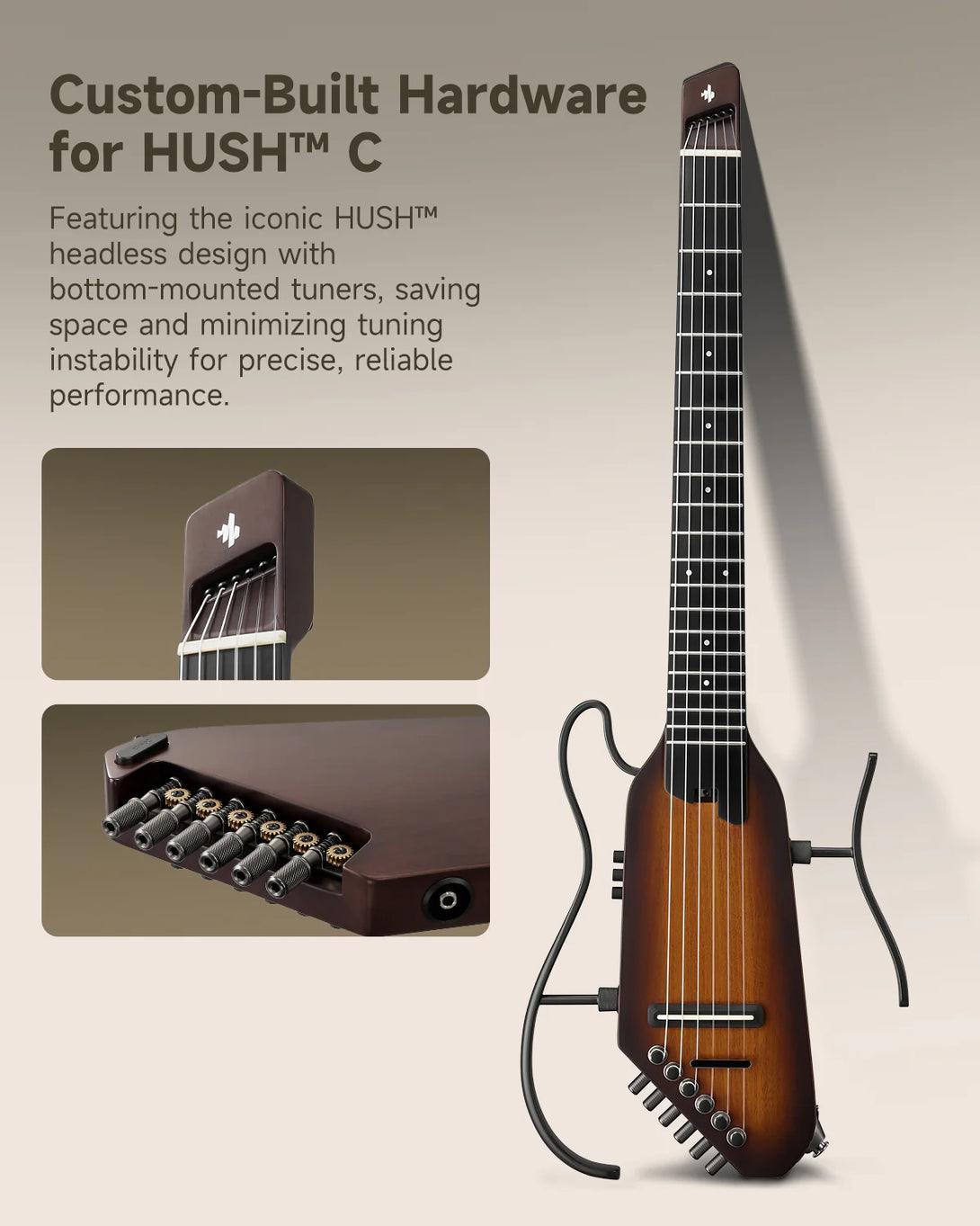 La Donner HUSH™ C es una guitarra electroacústica de cuerdas de nylon diseñada para quienes buscan comodidad, portabilidad y un sonido natural en un formato moderno y silencioso. Su diseño headless, construcción ligera y electrónica HPS-II la convierten en una excelente opción para estudio, práctica nocturna, viajes o espacios donde el volumen debe mantenerse bajo control.