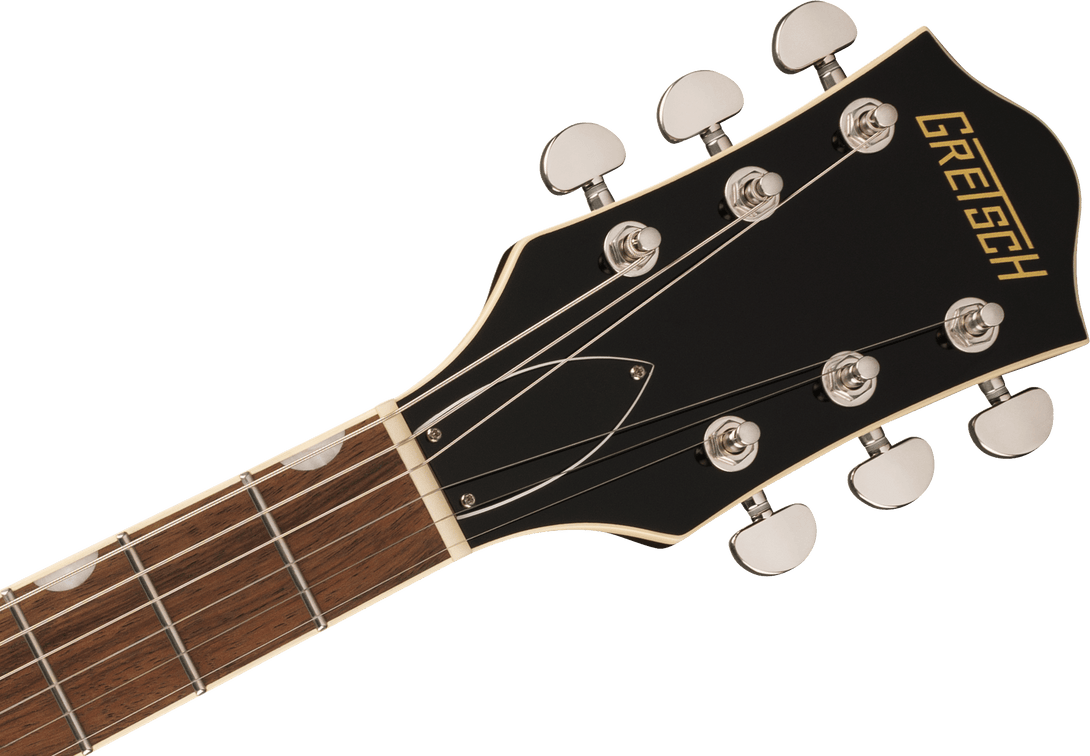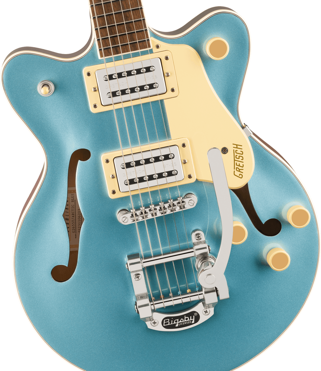 Equipada con las nuevas pastillas Broad’Tron™ BT-3S, esta Streamliner entrega un tono moderno y definido: medios más pronunciados, graves ajustados y agudos brillantes, manteniendo la esencia musical característica de la marca. El vibrato Bigsby® B50 añade ese movimiento suave y expresivo que solo Gretsch puede ofrecer.