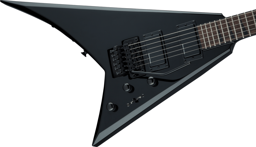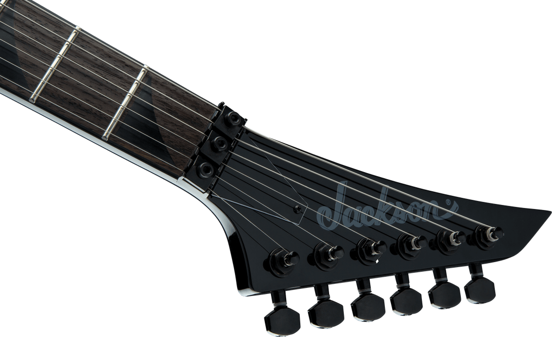 El puente Floyd Rose Special Double-Locking Tremolo, montado en cavidad (recesado), permite un rango de acción mayor para vibratos profundos y técnicas extremas, manteniendo una afinación estable. El acabado Gloss Black, las incrustaciones Sharkfin negras y el hardware negro consolidan una estética agresiva y distintiva de Jackson.