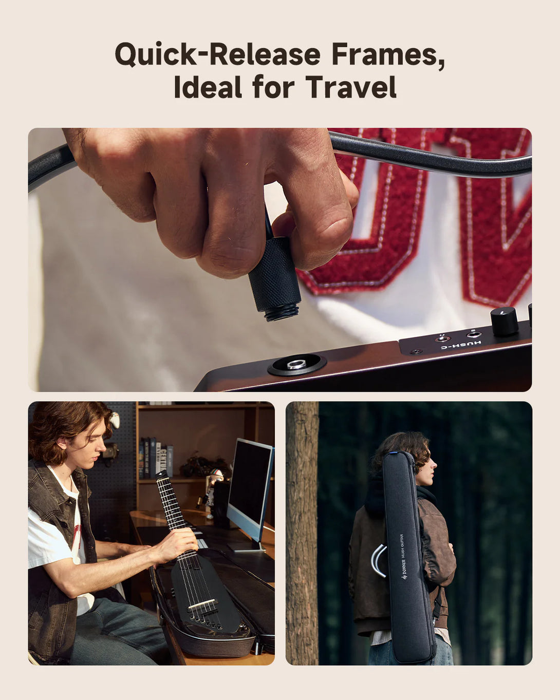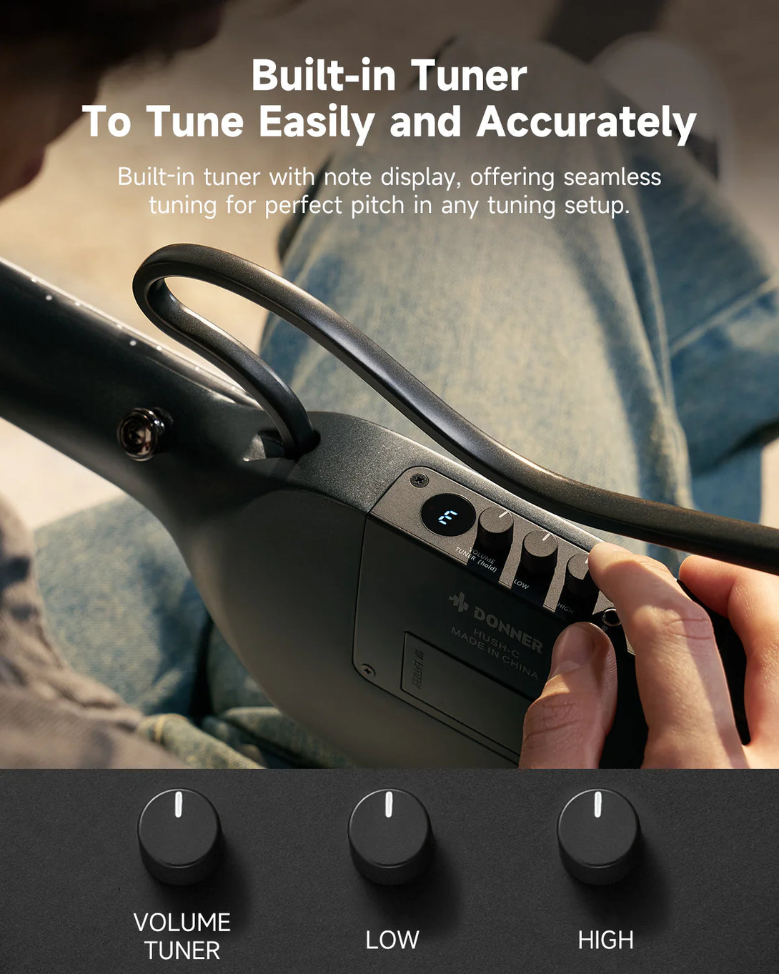 La Donner HUSH™ C es una guitarra electroacústica de cuerdas de nylon diseñada para quienes buscan comodidad, portabilidad y un sonido natural en un formato moderno y silencioso. Su diseño headless, construcción ligera y electrónica HPS-II la convierten en una excelente opción para estudio, práctica nocturna, viajes o espacios donde el volumen debe mantenerse bajo control.