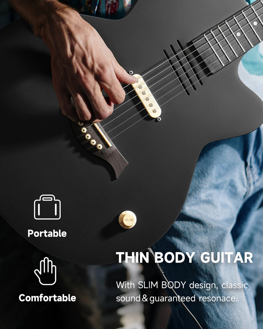 Incluye un kit completo de accesorios: estuche, afinador, correa, púas, capo y caja de accesorios, lista para usar desde el primer momento.