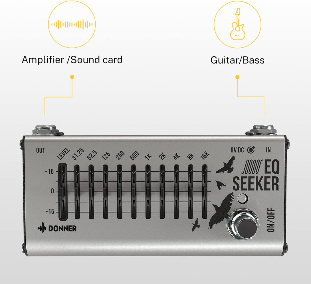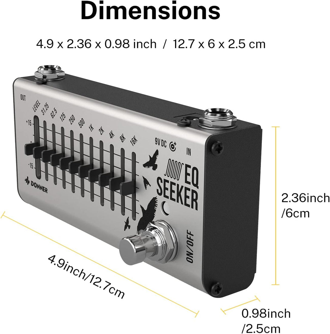El Donner EQ Seeker es un ecualizador gráfico analógico de 10 bandas diseñado para ofrecer un control tonal preciso, una respuesta dinámica estable y la máxima fidelidad al tono original del instrumento. Su formato compacto y su amplio rango de ajuste lo convierten en una herramienta versátil para guitarra eléctrica, acústica, bajo, teclado y otros instrumentos que requieren esculpir el sonido con detalle.