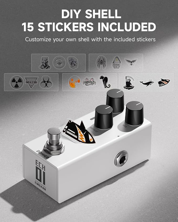 Una de sus virtudes más destacadas es su carcasa personalizable, que incluye un set de 15 calcomanías para que puedas crear tu propio diseño o añadir detalles decorativos. Esto lo convierte en una opción funcional y creativa para guitarristas que buscan identidad visual en su pedalboard.