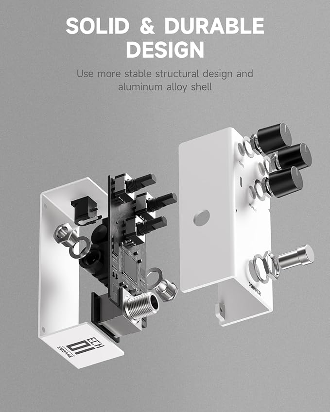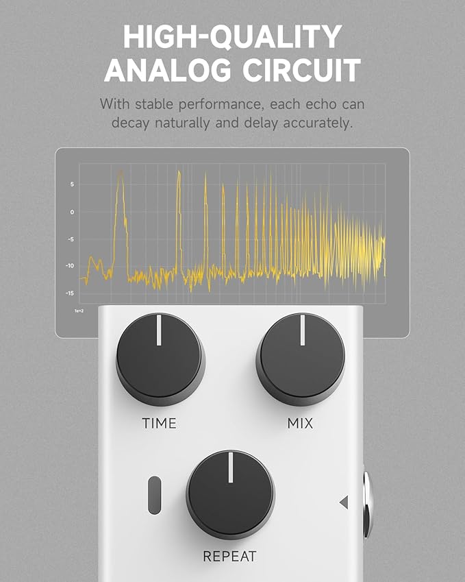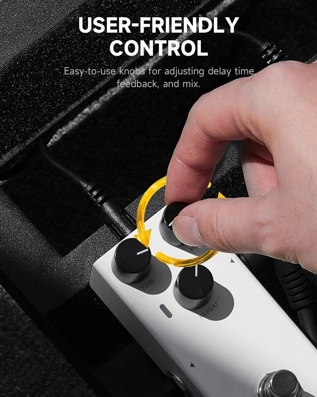 Construido en aleación de aluminio, combina resistencia y ligereza, ideal para presentaciones en vivo, estudio y práctica diaria. Su operación es sencilla e intuitiva, con controles que permiten ajustar rápidamente el tiempo y nivel de delay. Además, su True Bypass garantiza que la señal permanezca completamente limpia cuando el efecto está desactivado.