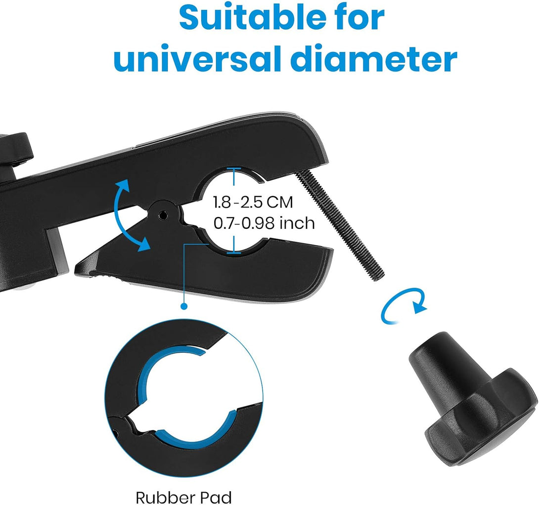 Se monta directamente en postes o barras tubulares de hasta 1" de diámetro (~0.98"). Fijo y seguro en segundos. -
